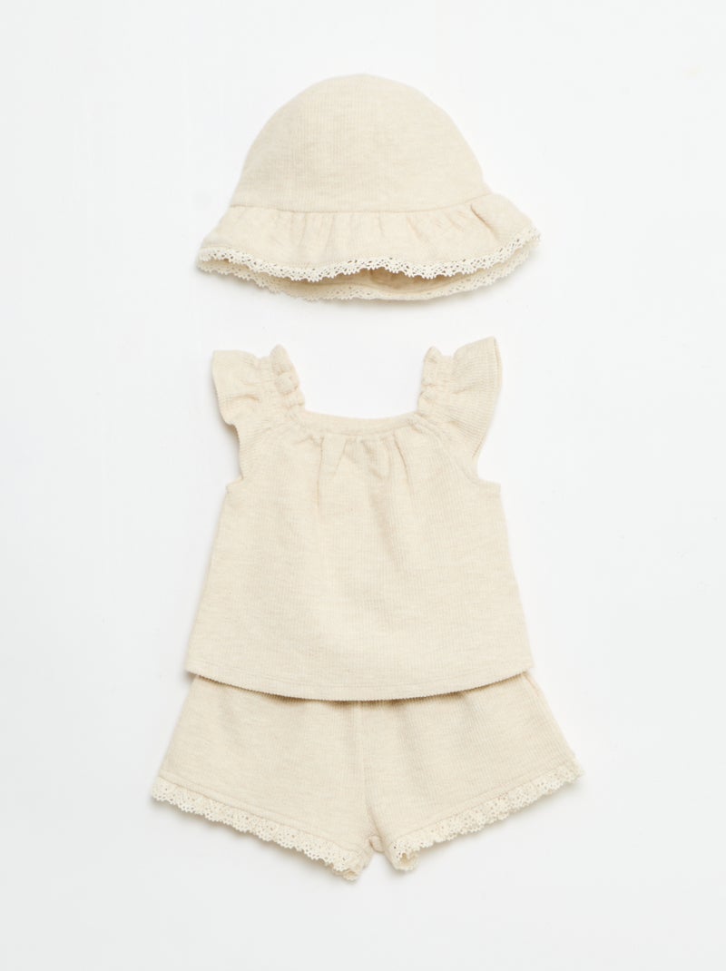 3-delige set van ribgebreide stof - short + T-shirt + bucket hat - Biege