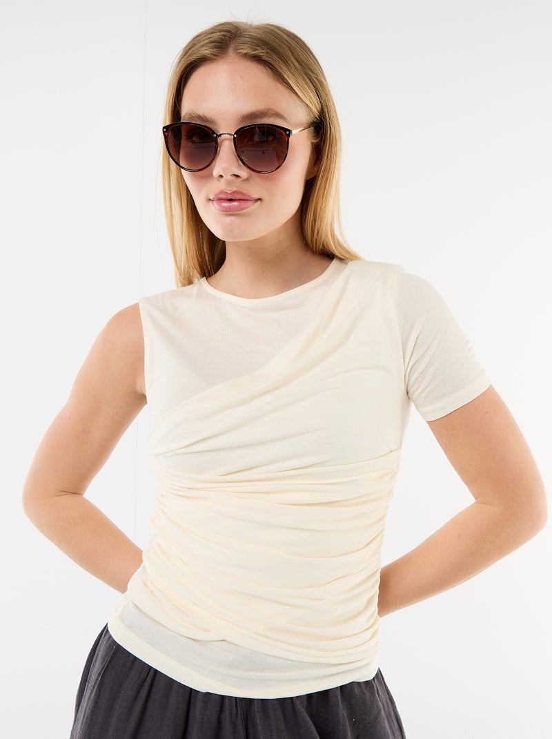 Asymmetrisch T-shirt met gedrapeerde schouder - Ecru
