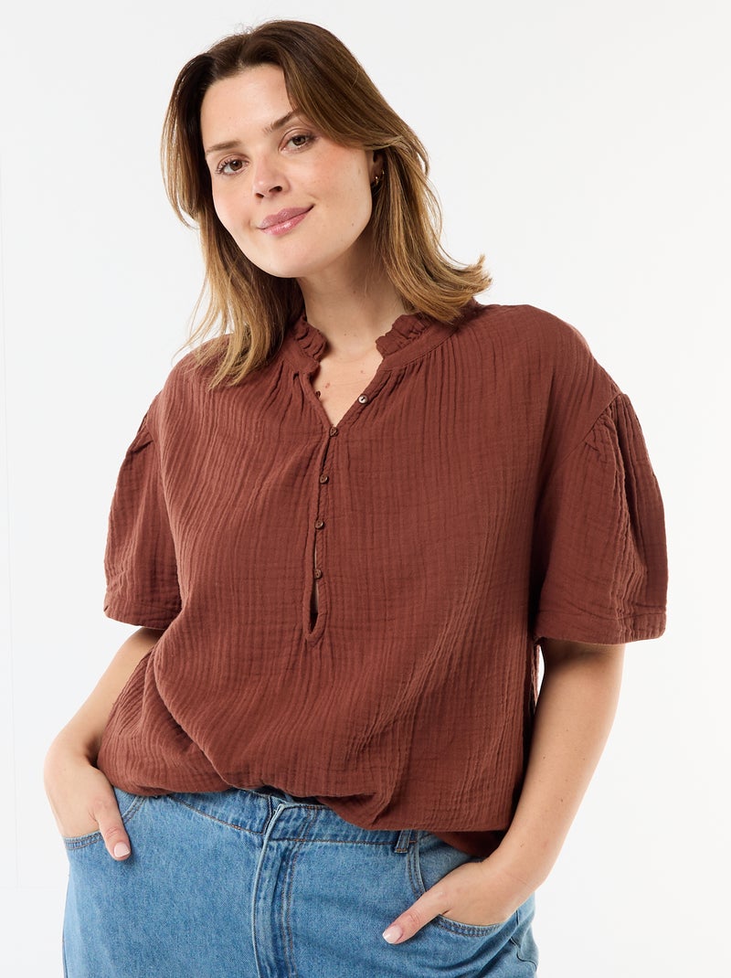 Blouse van katoengaas met gefronste kraag - Bruin