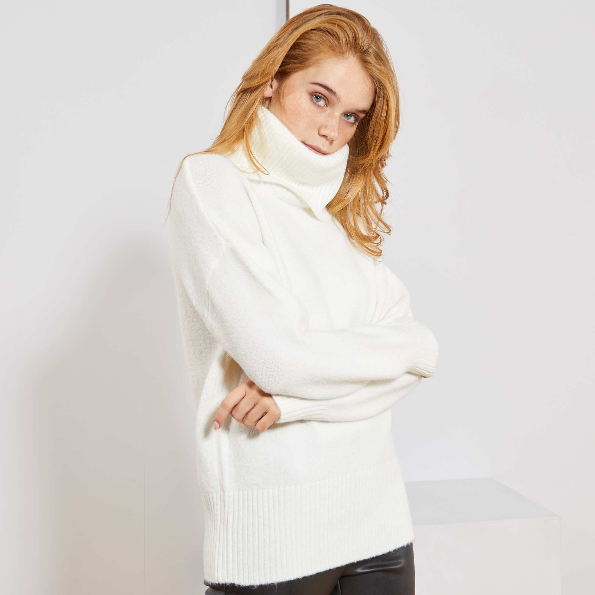 Deze trui van luchtig, stretch tricot is heerlijk om in weg te kruipen als het koud is.