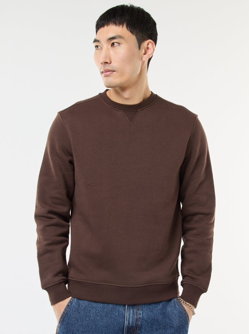 Effen sweater van geruwde fleece met ronde hals - Bruin