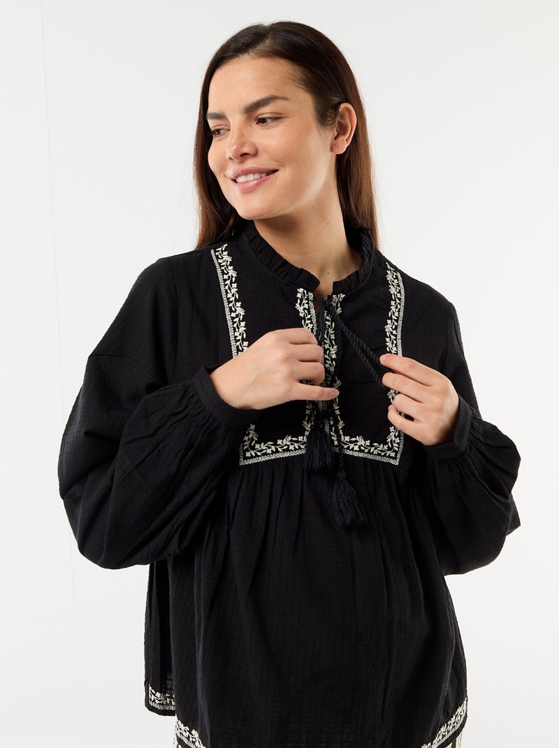 Geborduurde positieblouse van katoengaas - Zwart
