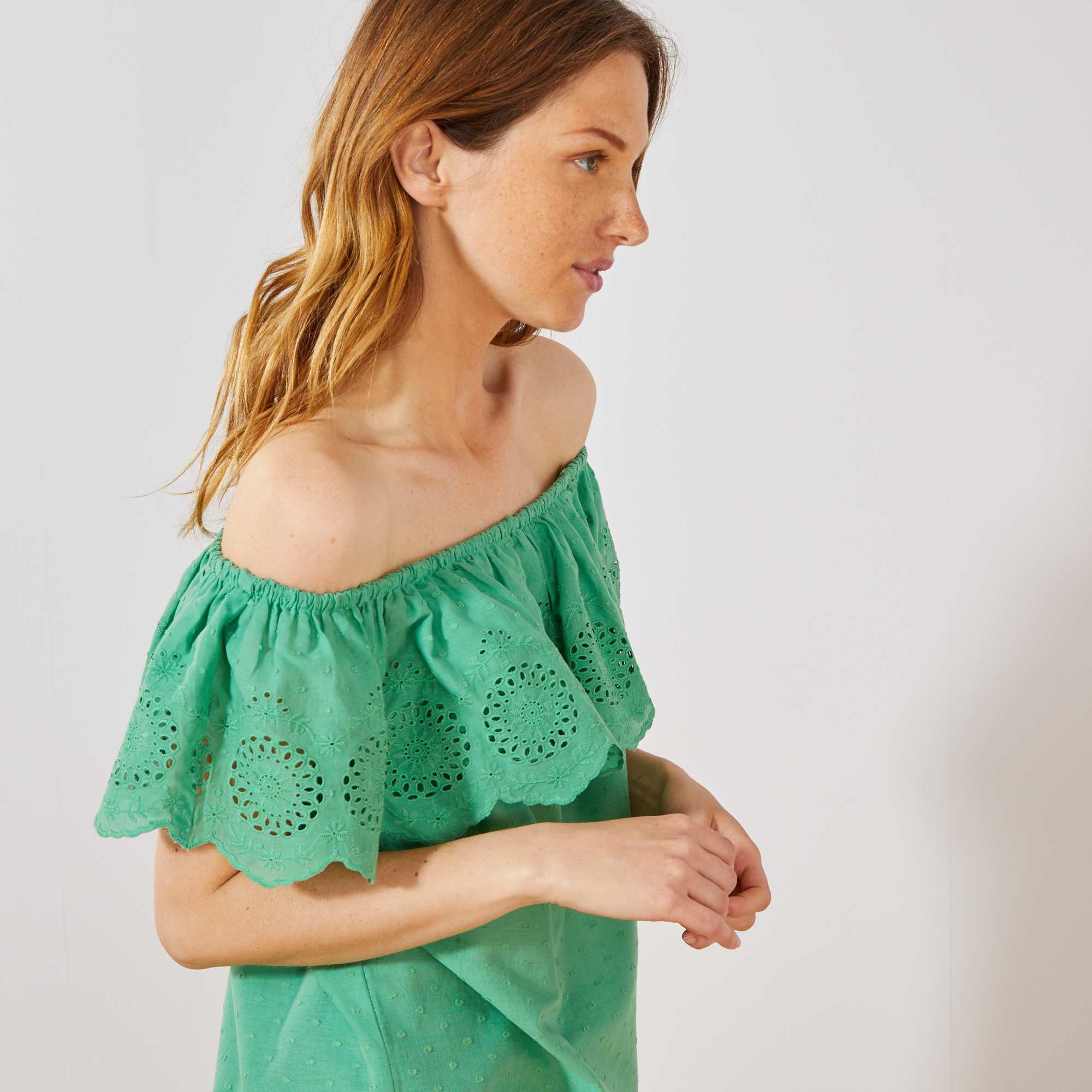 Wat zijn we toch gek op de verleidelijke bardothals! En al helemaal in deze versie van gestippeld katoen met een borduursel.