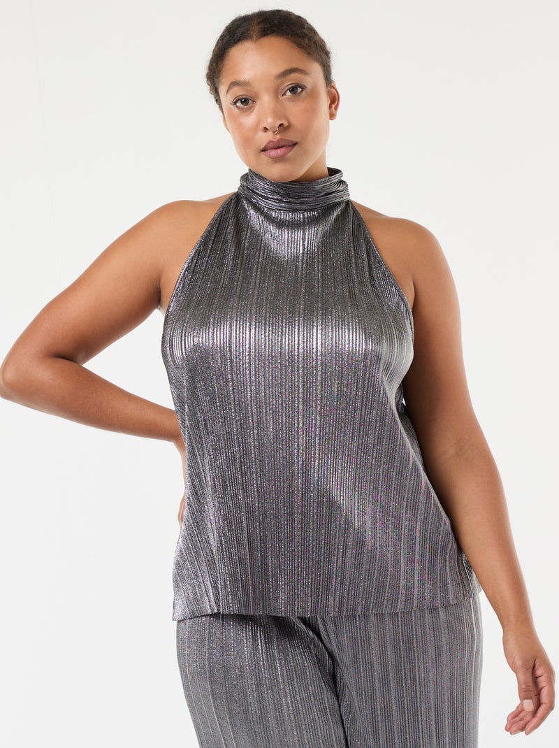 Met talloze opvallende details: zilverkleurige stof, wijde armsgaten, een opstaande kraag. Een absoluut verleidelijke top!