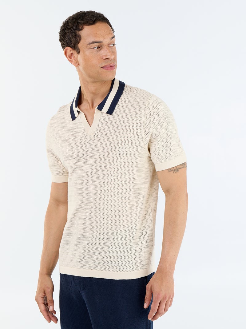 Opengewerkt gebreide polo met korte mouwen - Biege