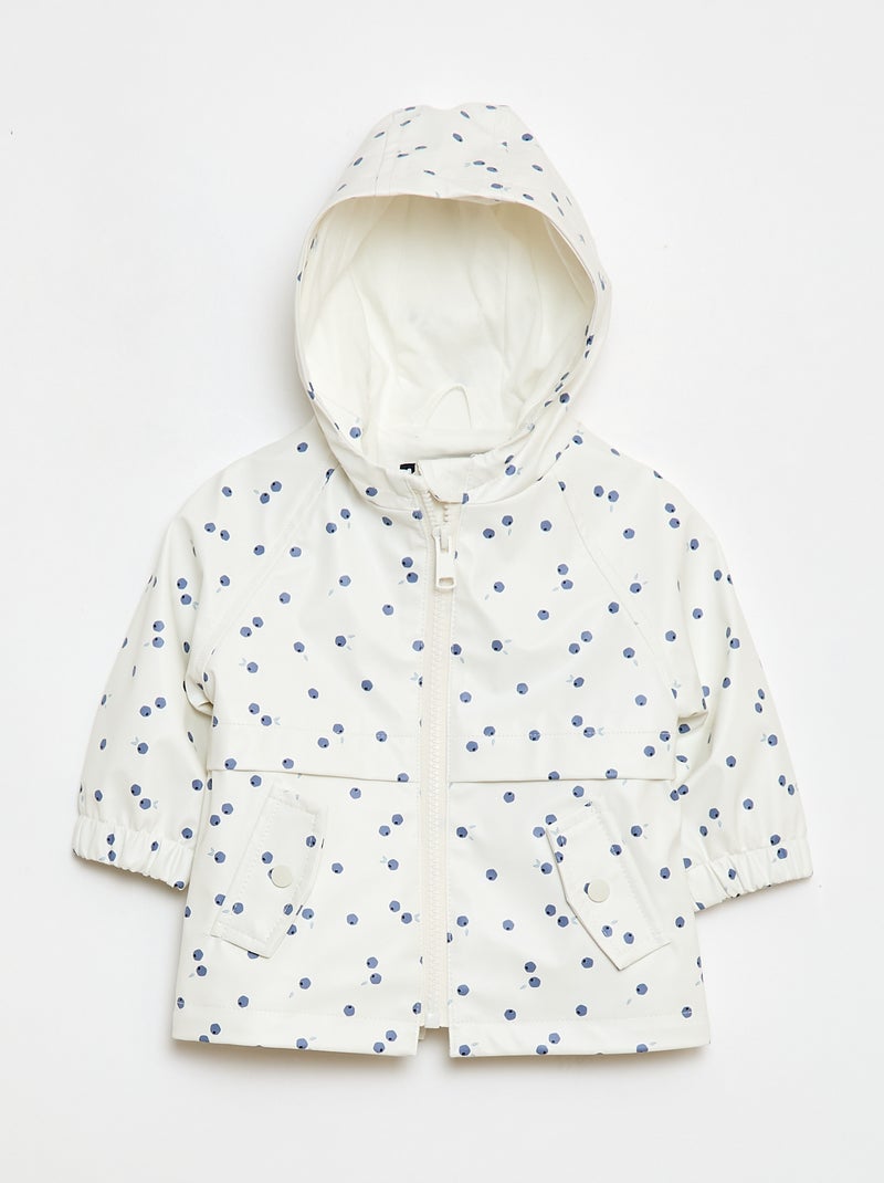 Een rubberen parka met kap, ontworpen om te beschermen tegen de regen, met een functionele pasvorm en praktische details.