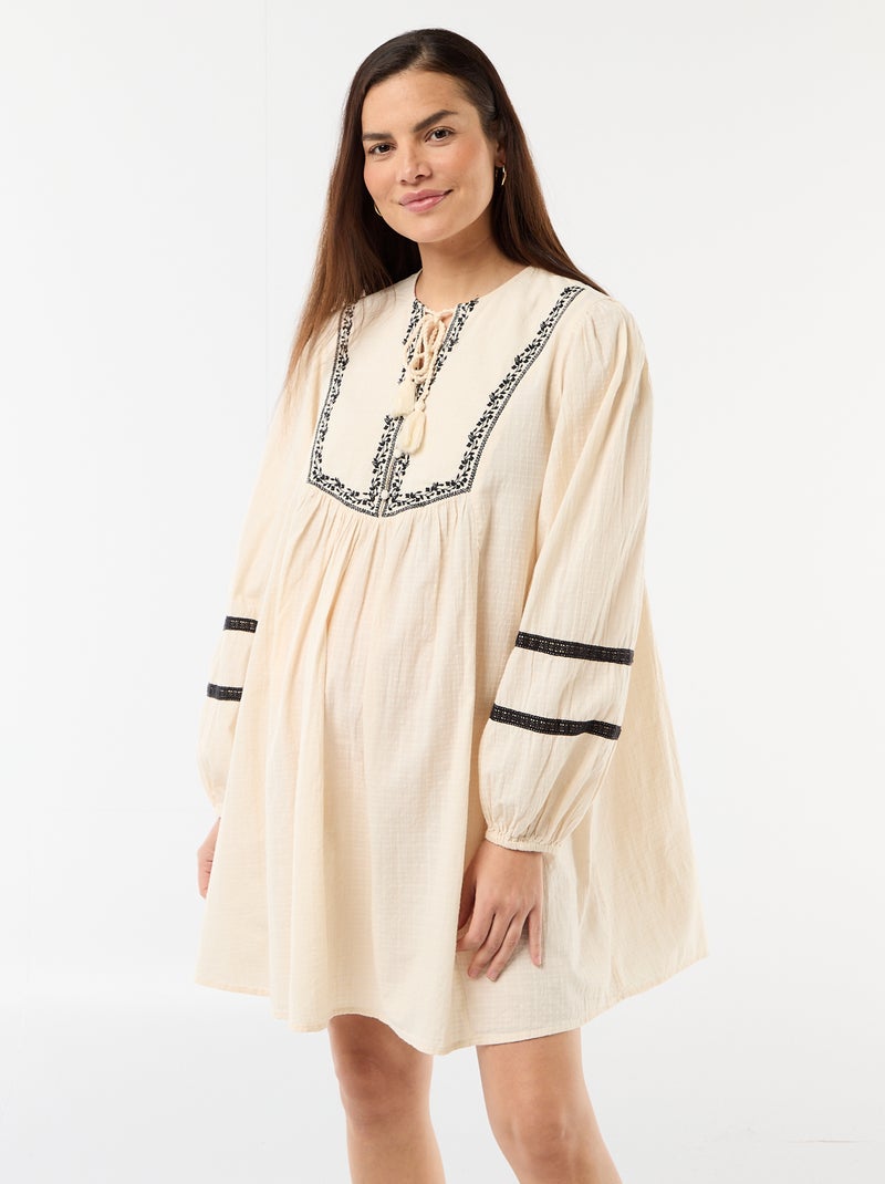 Deze jurk is supermakkelijk te dragen dankzij de uitlopende pasvorm en fantasieborduursels.