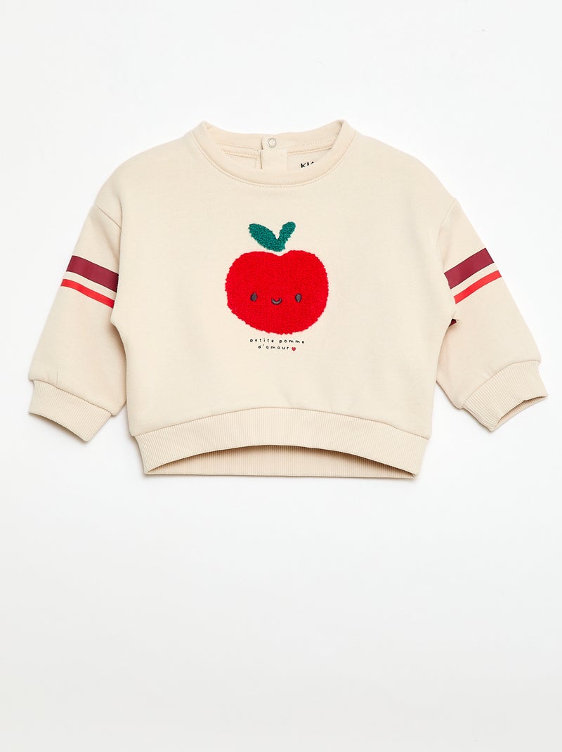 Een superzachte en schattige sweater voor jouw kleine meid!\n\n- Sweater van geruwde fleece (zacht en warm)\n- Ronde hals\n- Halve opening met drukknoopjes op de rug\n- Lange mouwen\n- Afwerking met ribboorden\n- Print van bouclé breisel op de voorkant