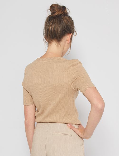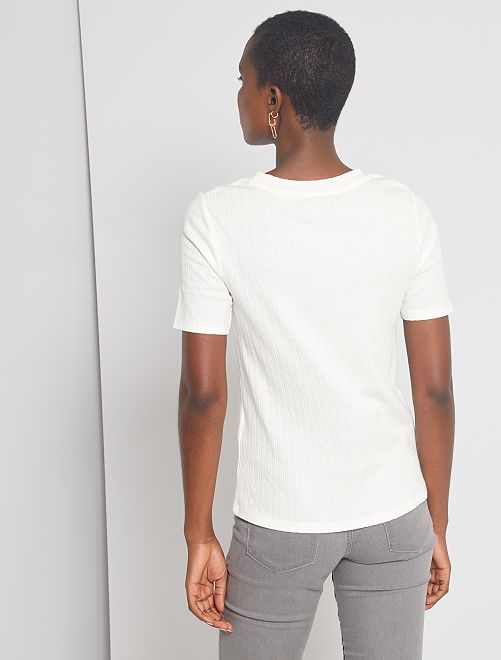 Mooi, geribd fantasietricot aan een zacht prijsje... Redenen genoeg om je dit T-shirt aan te schaffen!