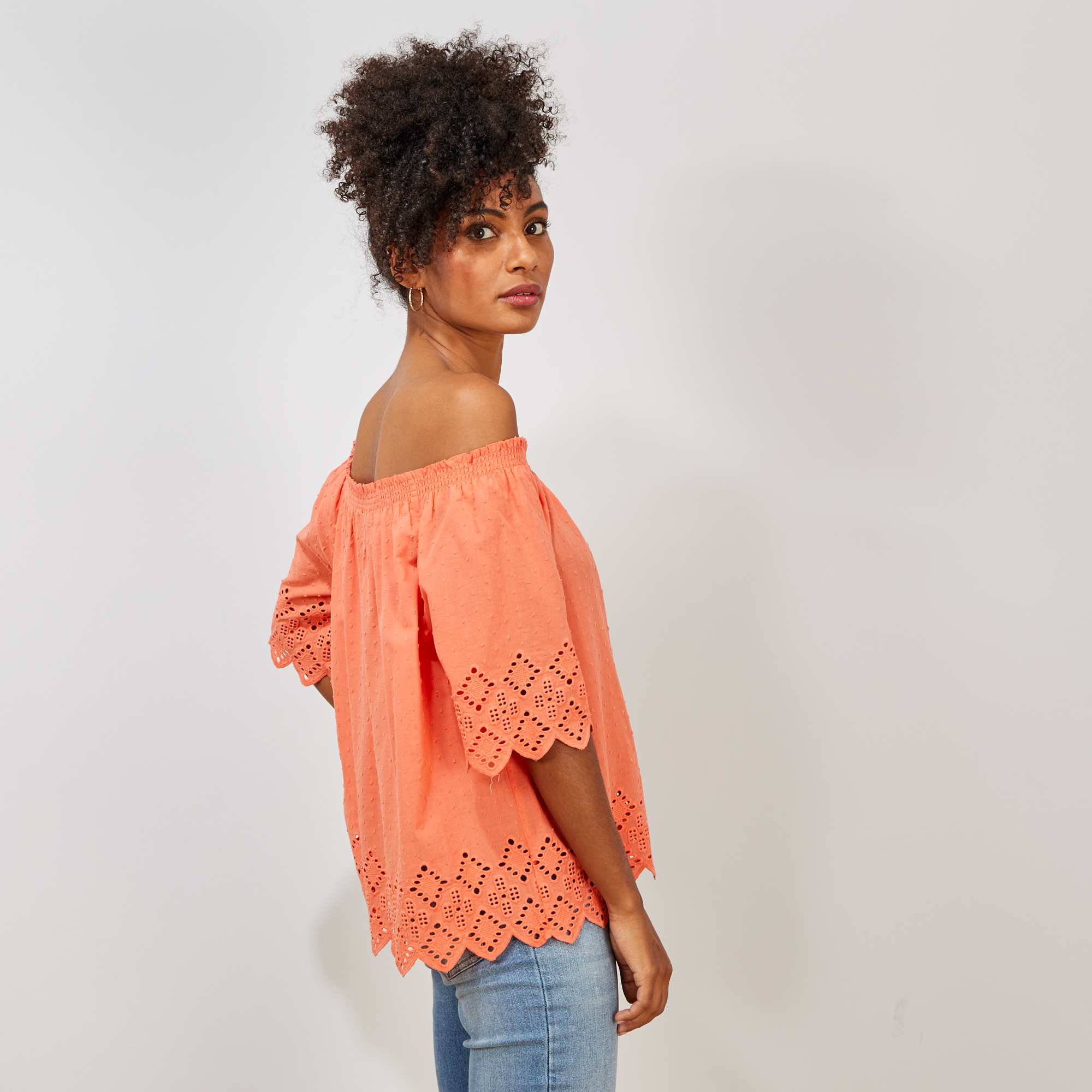- Driekwartmouwen met borduursels en een schubvormige afwerking aan de onderkant