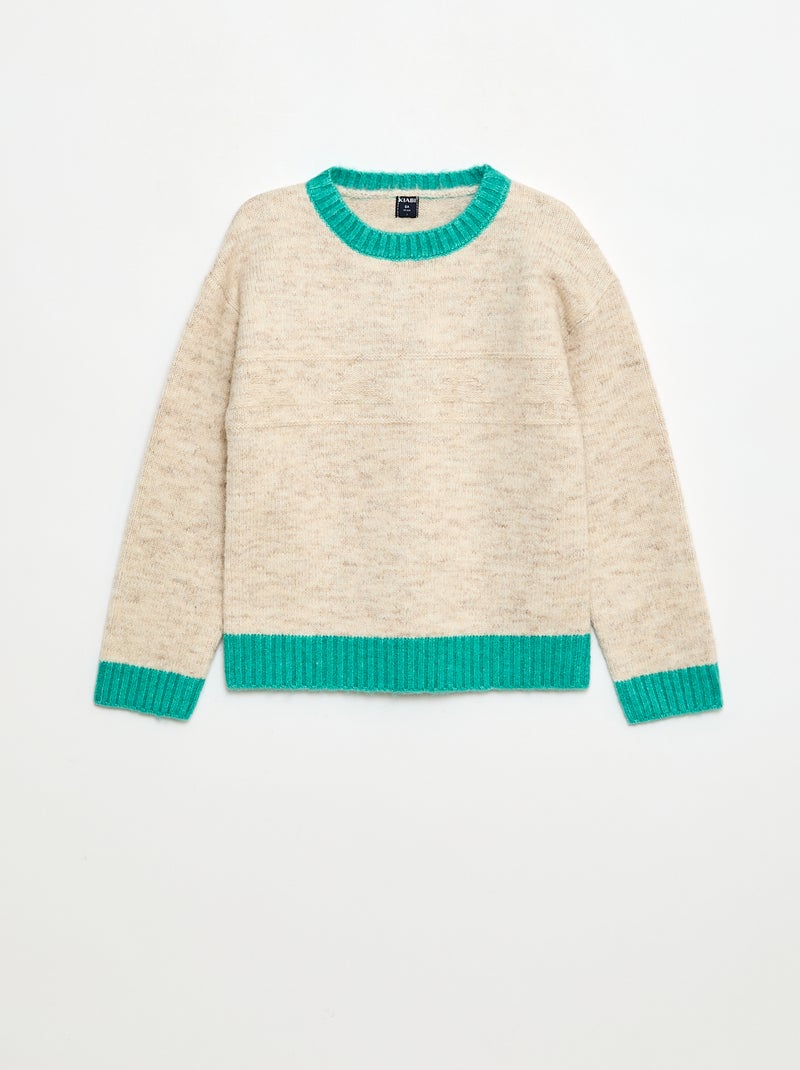 Trui : 81% polyester, 12% acryl, 4% wol, 3% elastaan, waarvan 81% Gerecycled polyester GRS