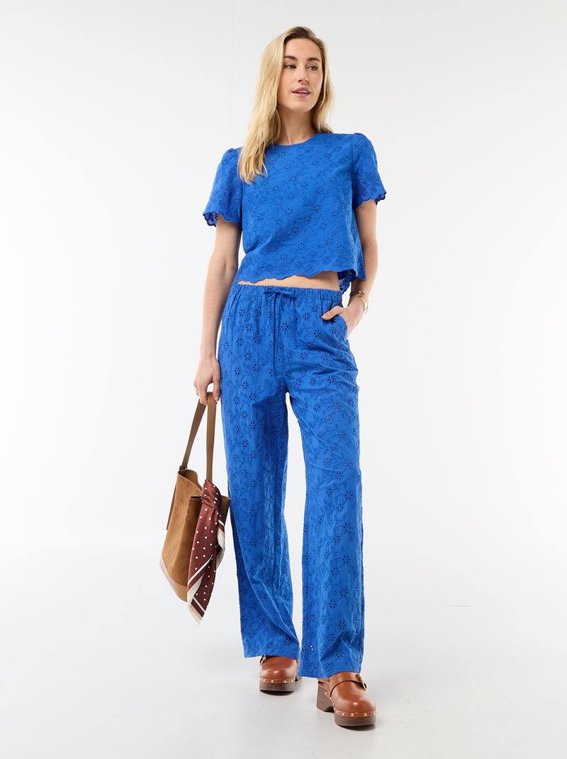 Wijde broek met Engels borduurwerk van effen katoen - Blauw